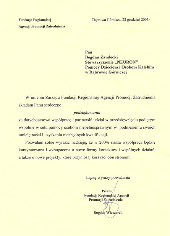 Fundacja Regionalnej Agencji Promocji Zatrudnienia, Grudzień 2003