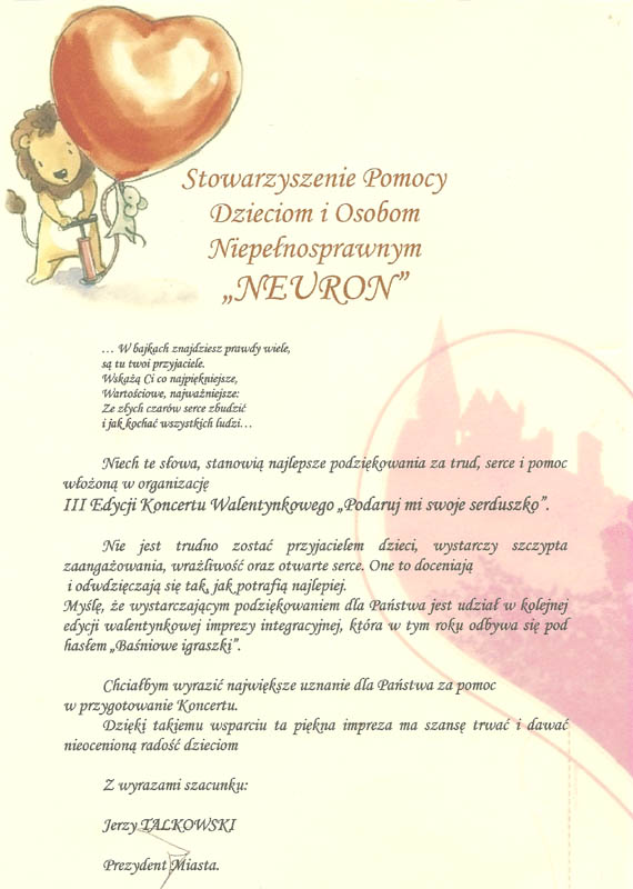 Prezydent Miasta, za III Edycję Koncertu Walentynkowego "Podaruj mi swoje serduszko"