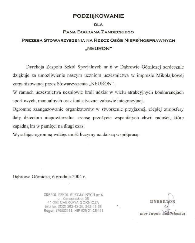 Dyrekcja Zespołu Szkół Specjalnych nr 6, Grudzień 2004