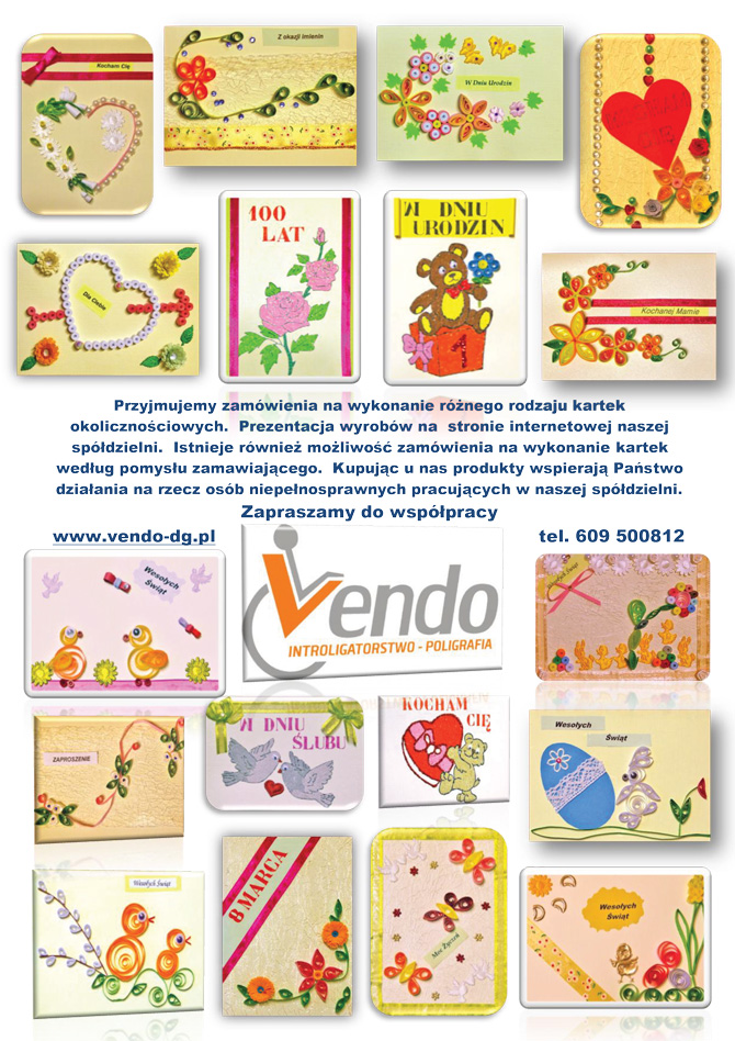 Przyjmujemy zamówienia na wykonanie różnego rodzaju kartek okolicznoÅ›ciowych. Prezentacja wyrobów na stronie internetowej naszej spóÅ‚dzielni. Istnieje również możliwość zamówienia na wykonanie kartek wedÅ‚ug pomysÅ‚u zamawiajÄ…cego. KupujÄ…c u nas produkty wspierajÄ… PaÅ„stwo dziaÅ‚ania na rzecz osób niepeÅ‚nosprawnych pracujÄ…cych w naszej spóÅ‚dzielni.