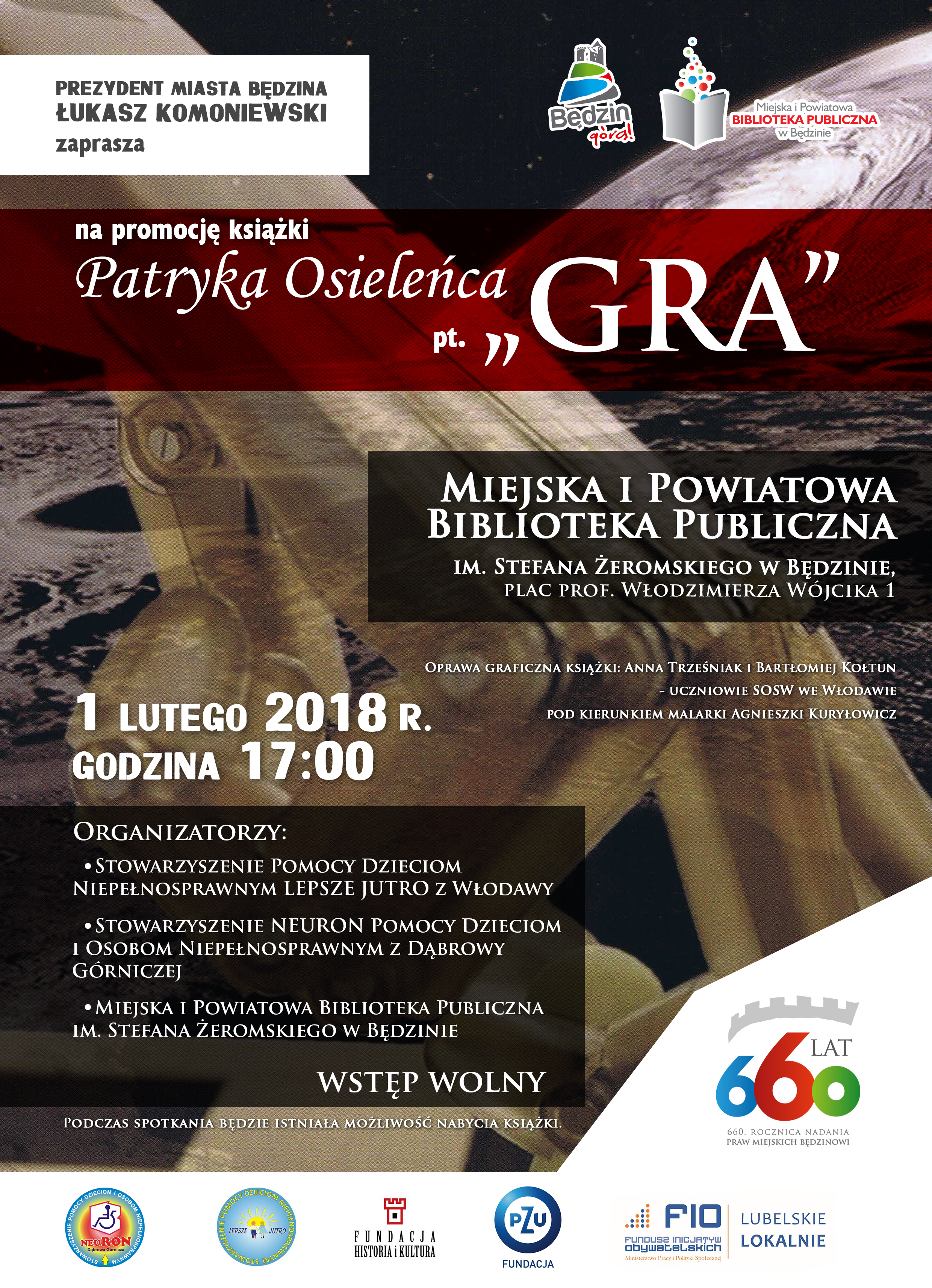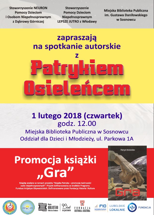 Stowarzyszenie NEURON Pomocy Dzieciom i Osobom NiepeÅ‚nosprawnym z DÄ…browy Górniczej oraz Stowarzyszenie LEPSZE JUTRO z WÅ‚odawy wspólnie z kierownictwem bibliotek w DÄ…browie Górniczej, Sosnowcu, BÄ™dzinie serdecznie zapraszajÄ… na spotkania promocyjne książki Patryka OsieleÅ„ca pt.”GRA”.