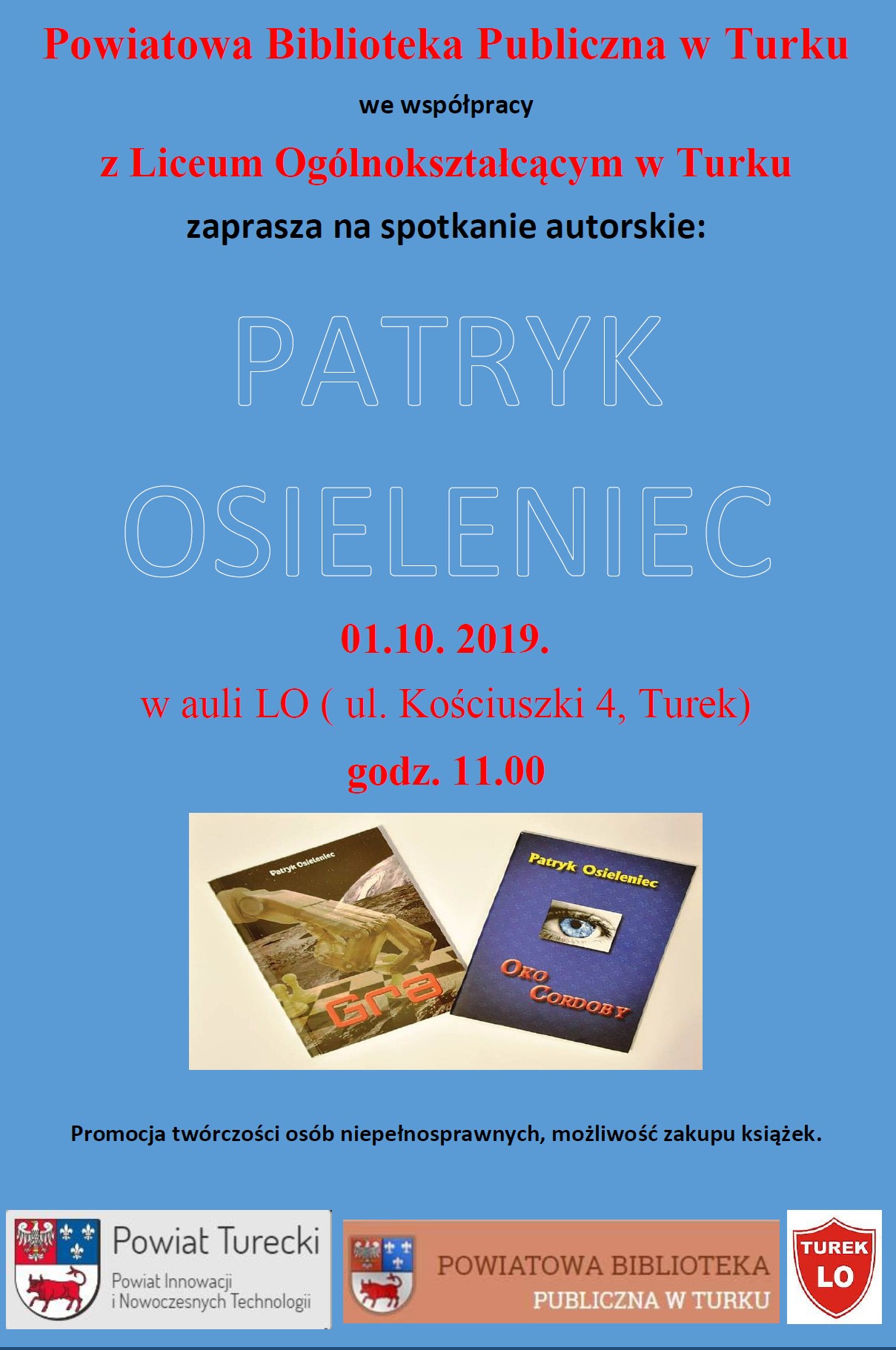 W dniach 1-3 października 2019 r. wspólnie ze Stowarzyszeniem Koniczynka z WÅ‚adysÅ‚awowa organizujemy spotkania autorskie w województwie wielkopolskim z autorem książek "GRA" i "OKO CORDOBY" Patrykiem Osieleniec, który jest osobÄ… niepeÅ‚nosprawnÄ…. Wszystkich zainteresowanych z terenu Turku i WÅ‚adysÅ‚awowa serdecznie zapraszamy.