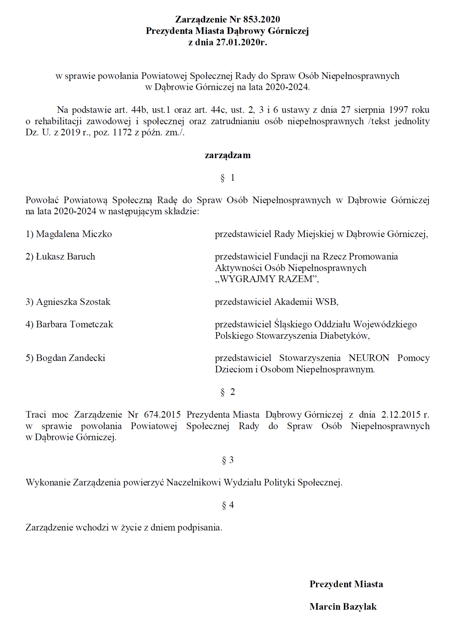 MiÅ‚o jest nam poinformować PaÅ„stwa, że PrzewodniczÄ…cy naszego stowarzyszenia kol. Bogdan Zandecki zostaÅ‚ powoÅ‚any przez Prezydenta Miasta DÄ…browy Górniczej na czÅ‚onka Powiatowej SpoÅ‚ecznej Rady d/s Osób NiepeÅ‚nosprawnych na lata 2020-2024.
