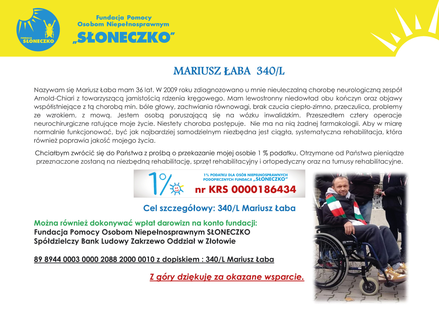 Dziś prezentujemy apel Mariusza Łaba, który zbiera środki na konto Fundacji Osobom Niepełnosprawnym „SŁONECZKO”.