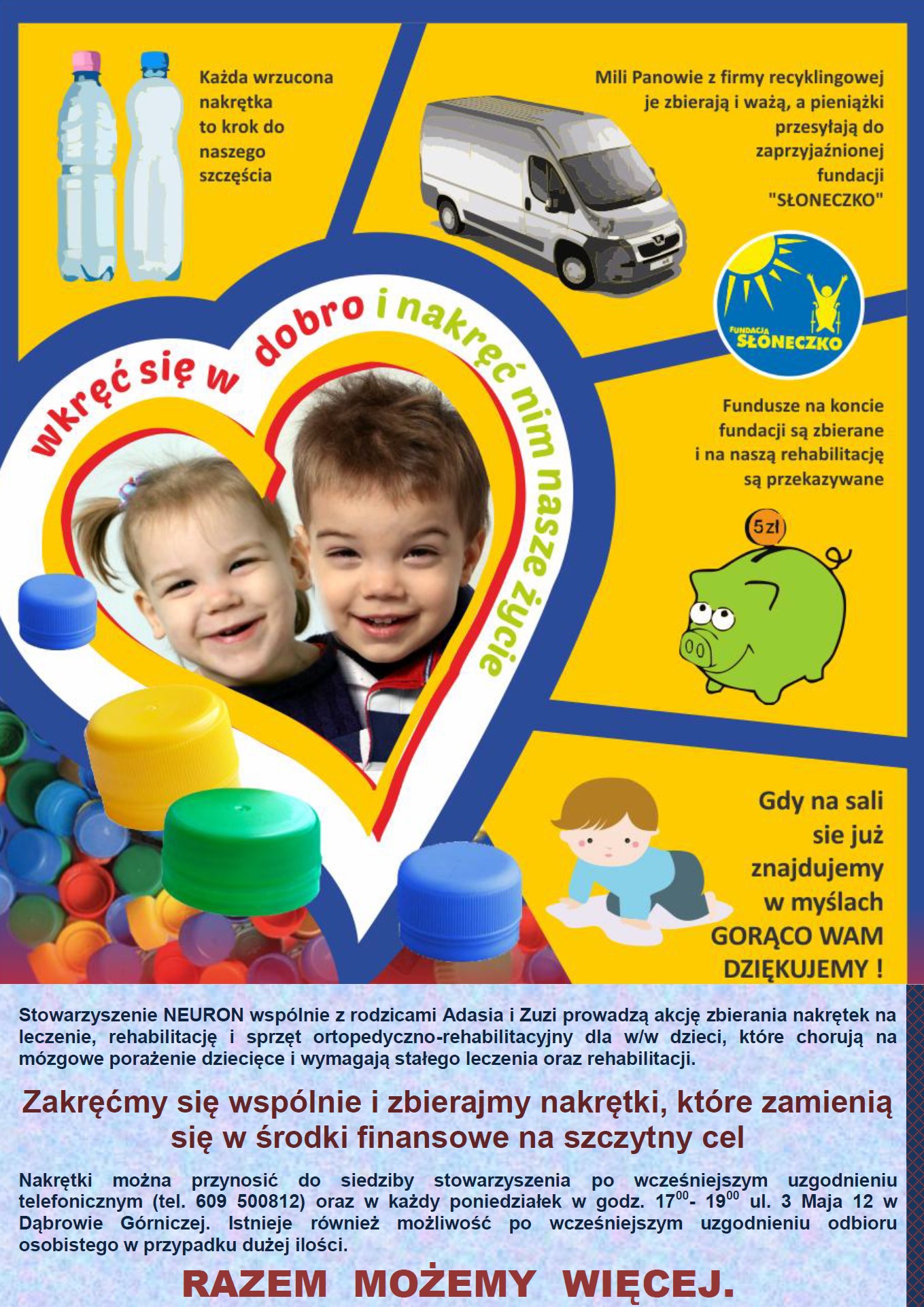 Stowarzyszenie nasze od 2019r prowadzi akcję zbierania nakrętek dla Adasia i Zuzi. Dzięki ludziom dobrej woli udało się już Nam sporo ich zebrać, jednakże to dalej kropla w morzu potrzeb.