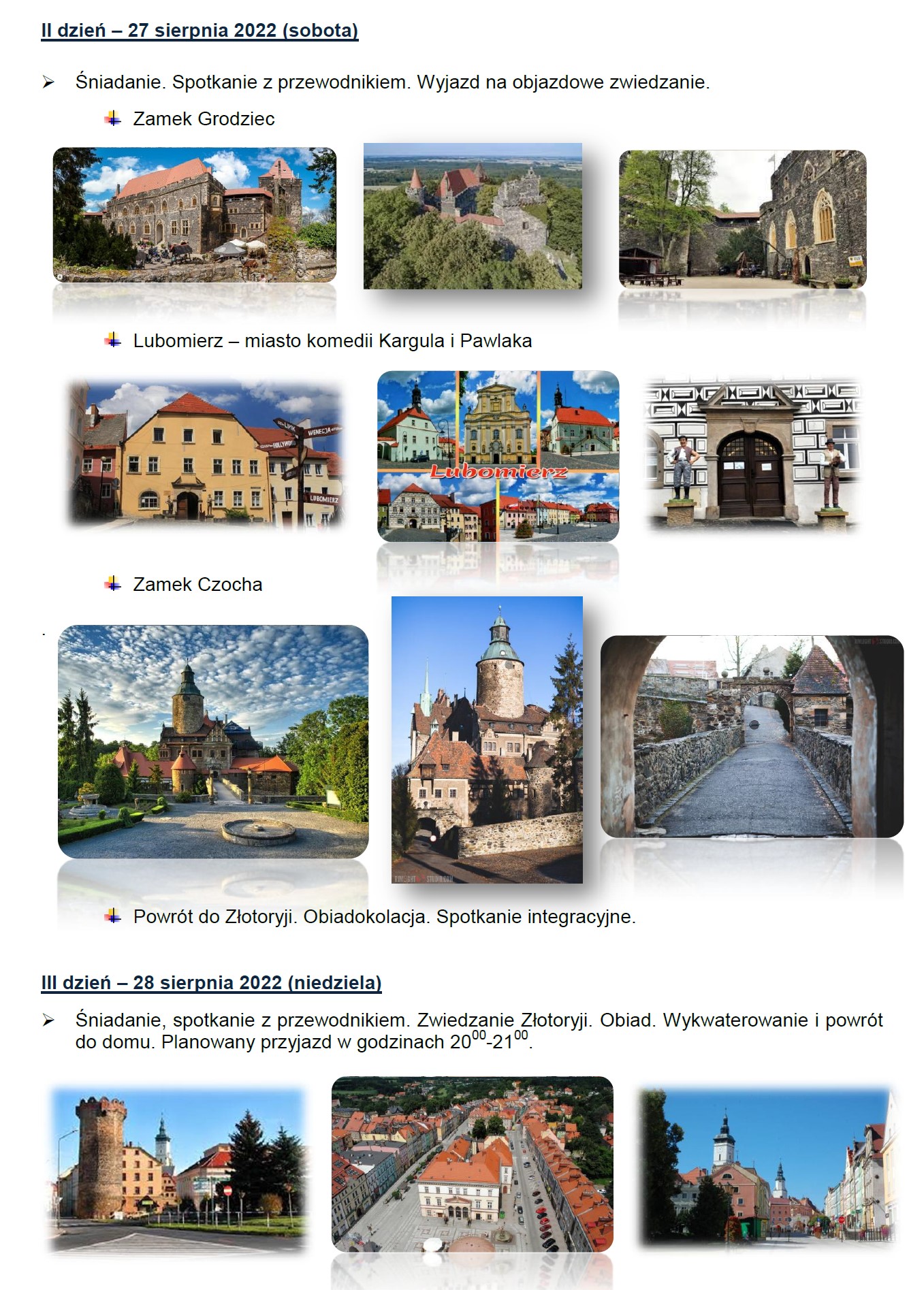 - Åšniadanie. Spotkanie z przewodnikiem. Wyjazd na obiazowe zwiedzanie trasÄ…: Grodziec (zamek), Lubomierz (miasto komedii Kargula i Pawlaka), Sucha (Zamek Czocha).