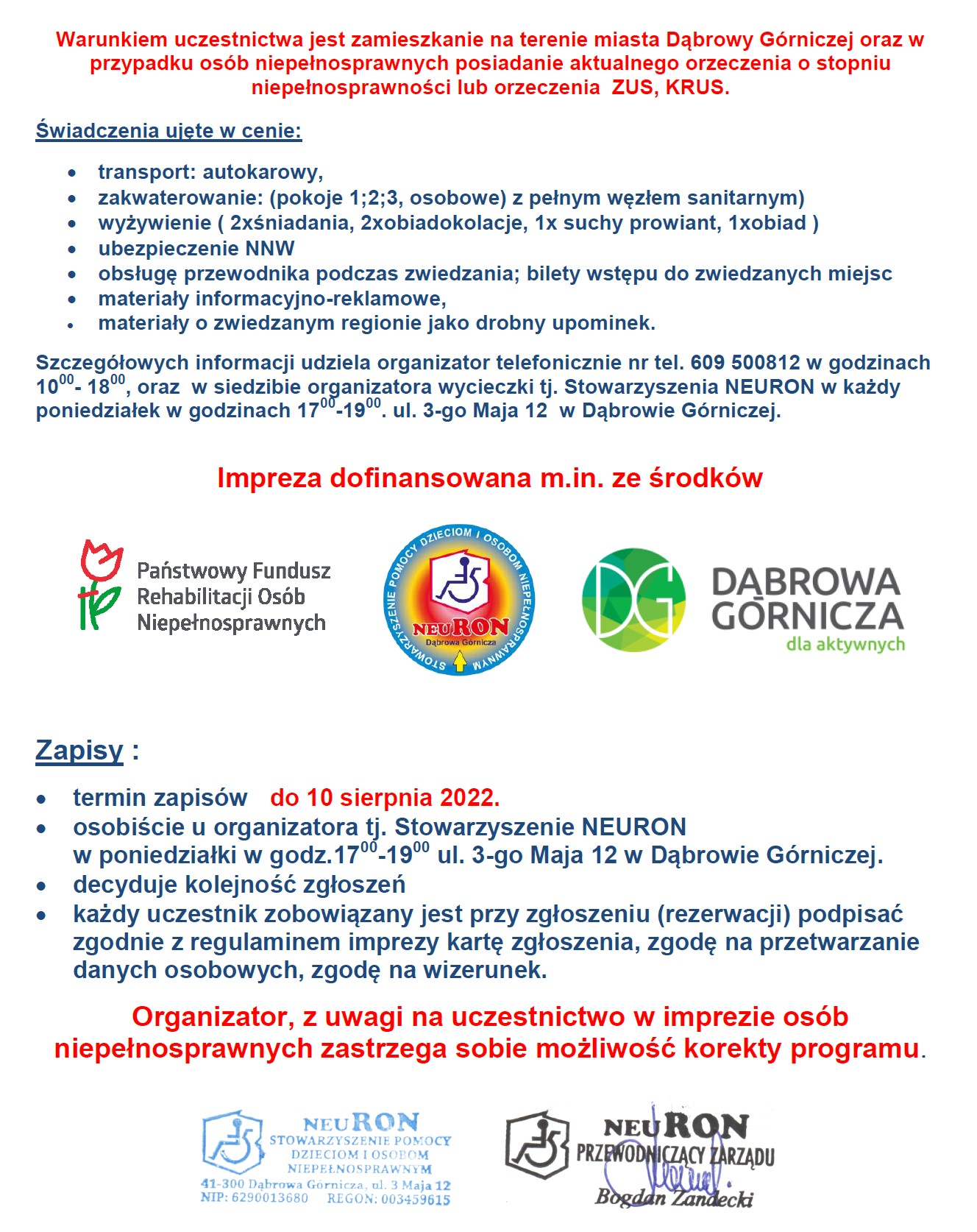 SzczegóÅ‚owych informacji udziela organizator telefonicznie (nr tel. 609 500 812) w godz. 10:00-18:00 oraz w siedzibie organizatora wyieczki, tj. Stowarzyszenia NEURON przy ul. 3 Maja 12 w DÄ…browie Górniczej, w każdy poniedziaÅ‚ek w godzinach 17:00-19:00.