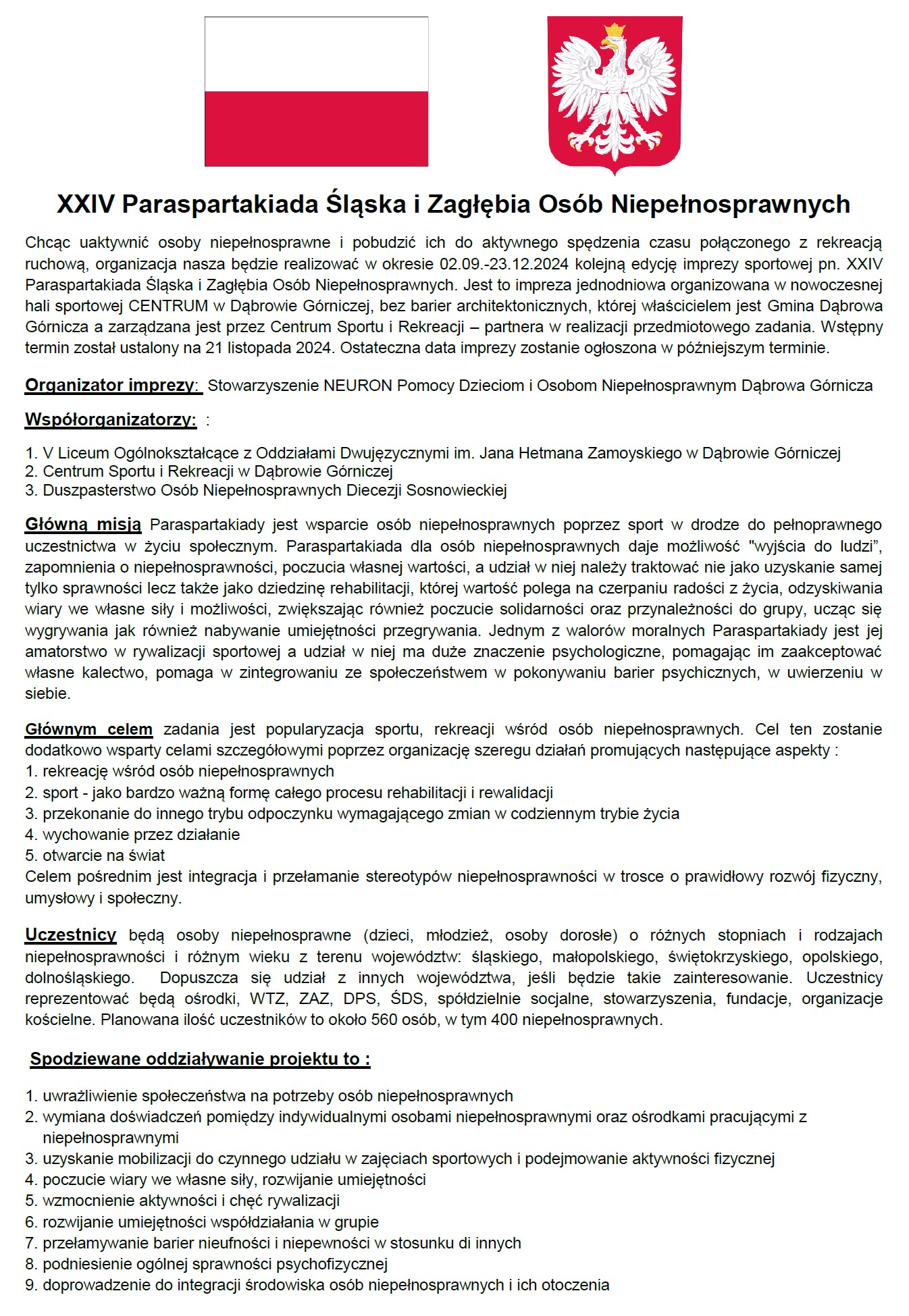 XXIV Paraspartakiada ÅšlÄ…ska i Zagłębia Osób NiepeÅ‚nosprawnych - projekt realizowany bÄ™dzie od wrzeÅ›nia 2024.