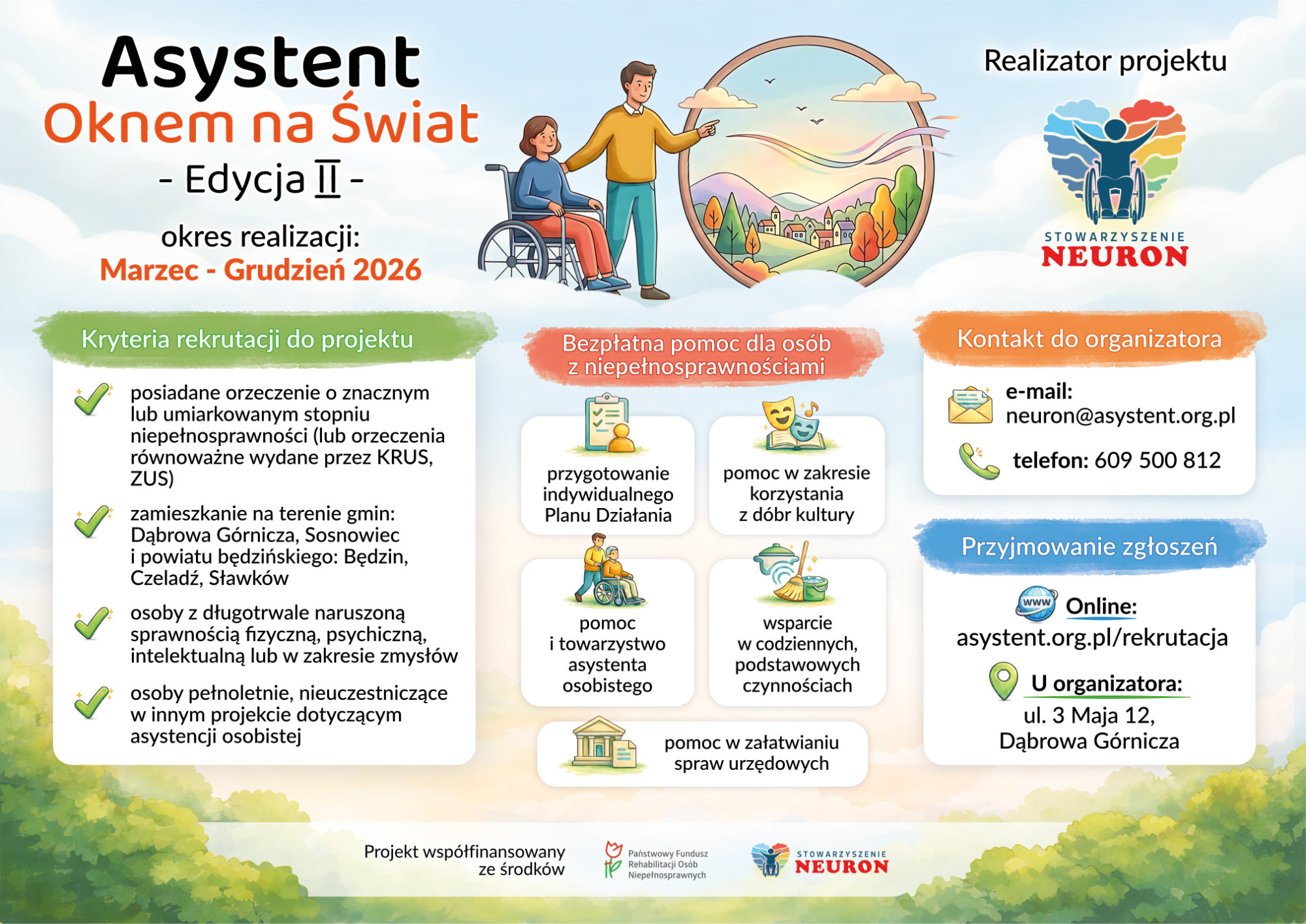 Z dniem 11 marca b.r. Stowarzyszenie NEURON rozpoczęło nabór uczestników do projektu „Asystent Oknem na Åšwiat – Edycja II”, realizowanego od marca do grudnia 2026 roku. Celem projektu jest zwiÄ™kszenie samodzielnoÅ›ci osób z niepeÅ‚nosprawnoÅ›ciami, poprawa ich codziennego funkcjonowania oraz wsparcie w aktywnym uczestnictwie w życiu spoÅ‚ecznym.